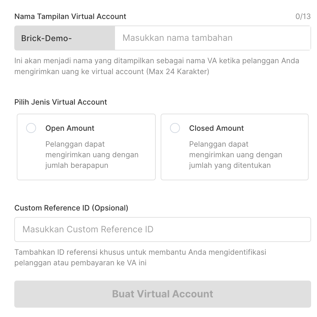 For a list of VAs that Brick provides, you can see the following technical documentation https://technical-docs.onebrick.io/docs/virtual-account-1