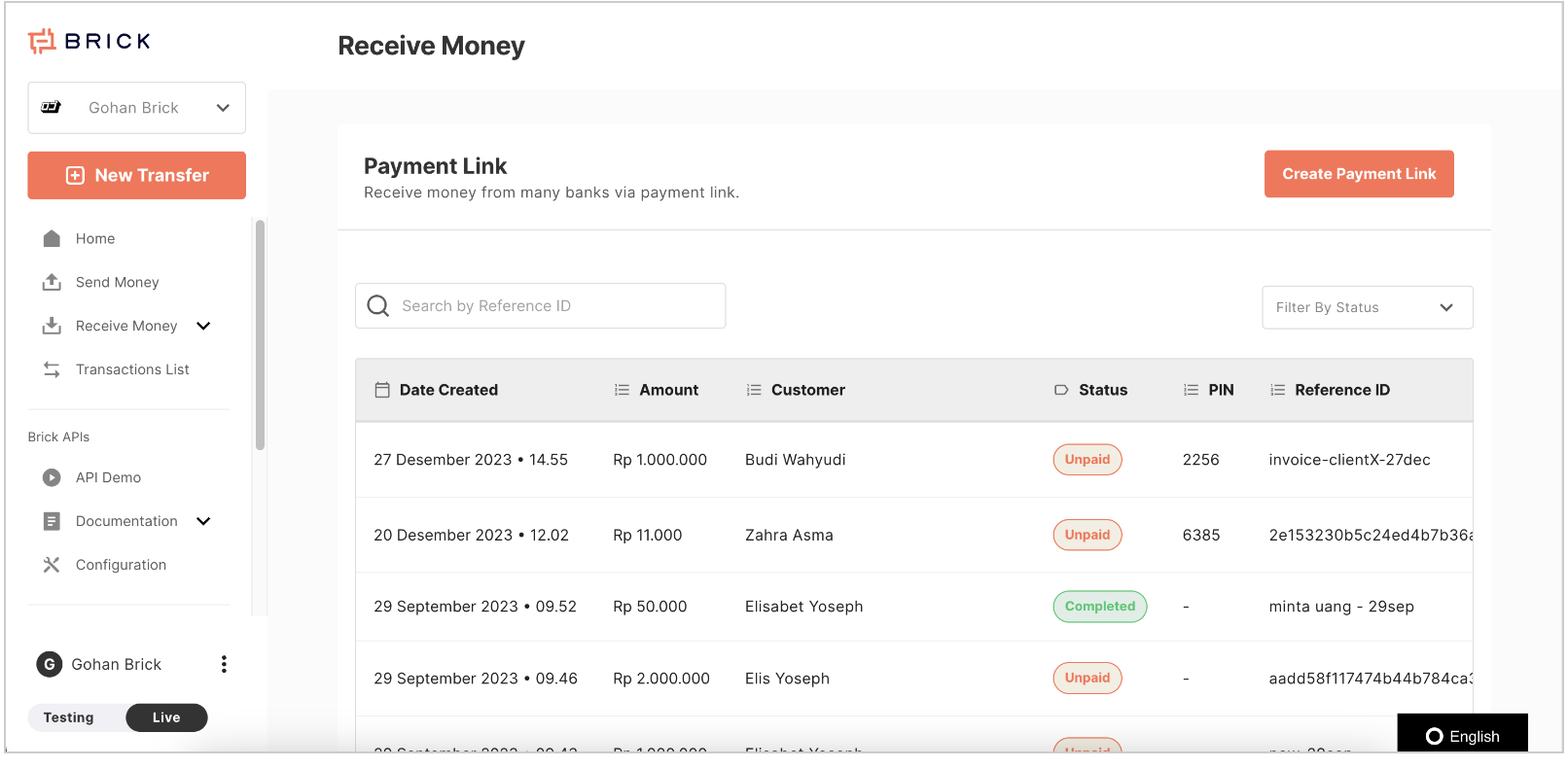 On your Brick Dashboard, you can go to the main page and on the left side of the menu select "Payment Link" then you can click "Create Payment Link" to create your Payment Link.